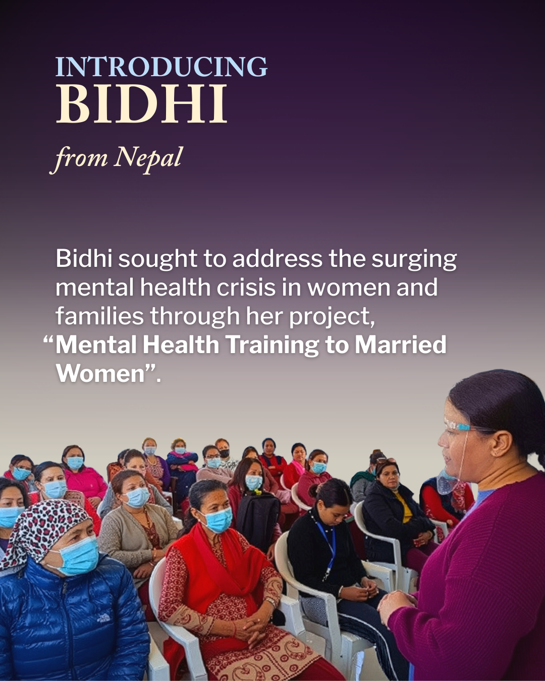 Bidhi Adhikari, a fellow of the Global Peace Women Leadership Academy, sought to address the issue in her community through her project, “Mental Health Training to Married Women.” With the project, Bidhi sparked conversations surrounding mental health and care. She specifically targeted women struggling with access to mental health services. Bidhi and her team provided participating women with tools to spot warning signs of mental health. They also conducted two successive sessions on Mental Health issues and conditions and stigma surrounding it.