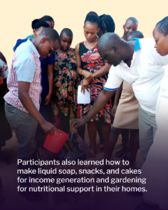 In addition, the project sought to address the social-economic factors that facilitate the spread of HIV/AIDS among women in the community. Poverty was pointed out as a key contributing factor and thus the project trained the participants on Household Economic Strengthening activities such as making hand sanitizers and re-usable sanitary pads. In addition, the participants learnt how to make bar soaps.