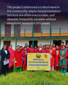 Despite logistical challenges, such as language barriers, scheduling conflicts, and unpredictable weather, the project saw remarkable success. Over 290 participants engaged in training sessions, surpassing the initial target of 180. By the end of the program, nearly all participants demonstrated increased knowledge and confidence in mediation. Many took part in role-playing exercises, panel discussions, and artistic expressions of peace. The initiative also fostered partnerships with schools, mothers’ clubs, and local governments to ensure the program’s sustainability beyond the training sessions.